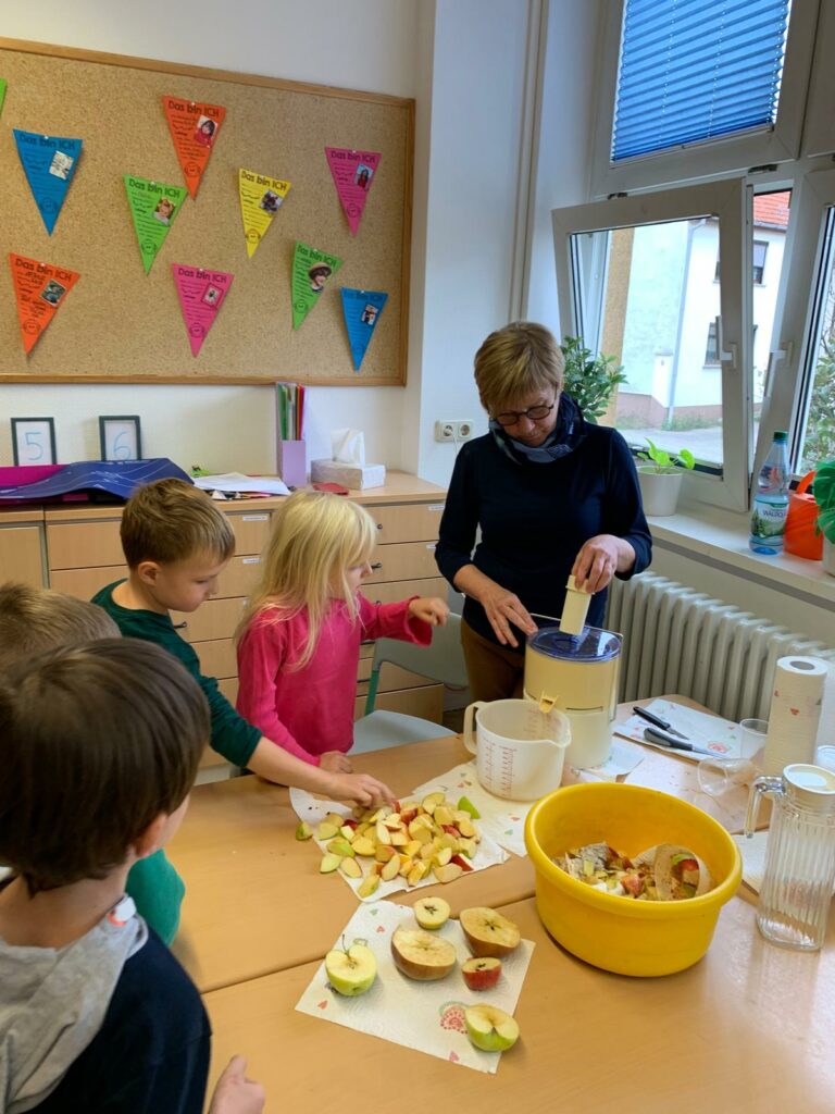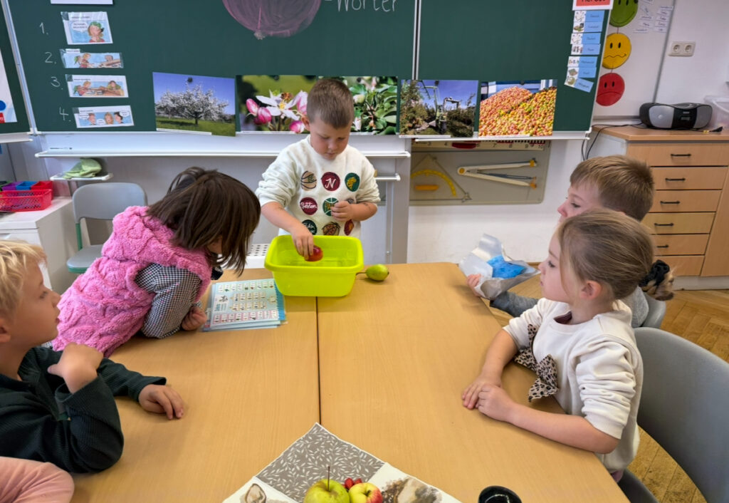Am letzten Schultag vor den Herbstferien fand in den ersten Klassen ein ganz besonderes Projekt statt: Alles drehte sich rund um den Apfel. Die Kinder wurden klassenübergreifend in Gruppen eingeteilt und durchliefen mit viel Neugier und Begeisterung verschiedene Stationen, bei denen der Apfel im Mittelpunkt stand.