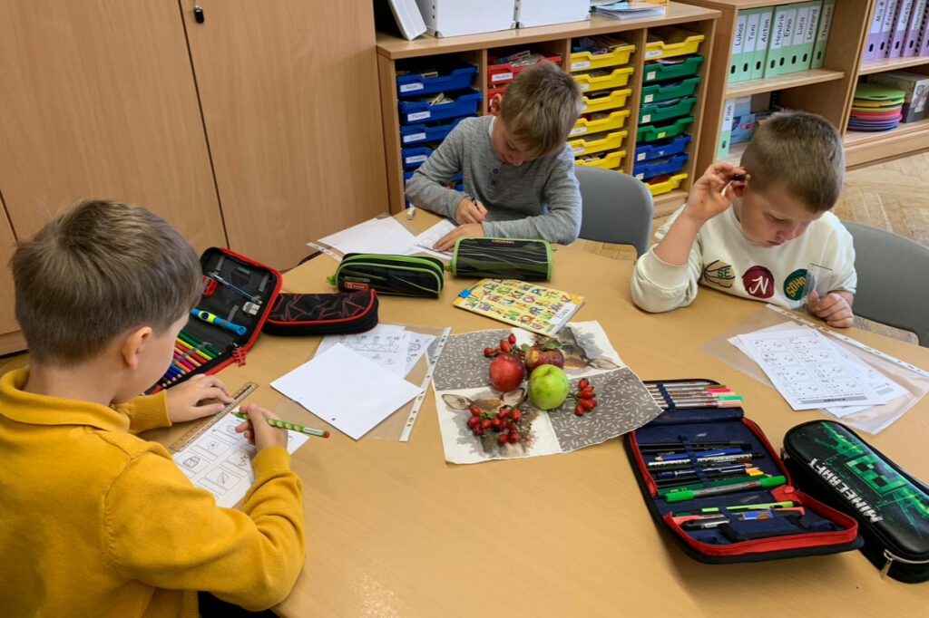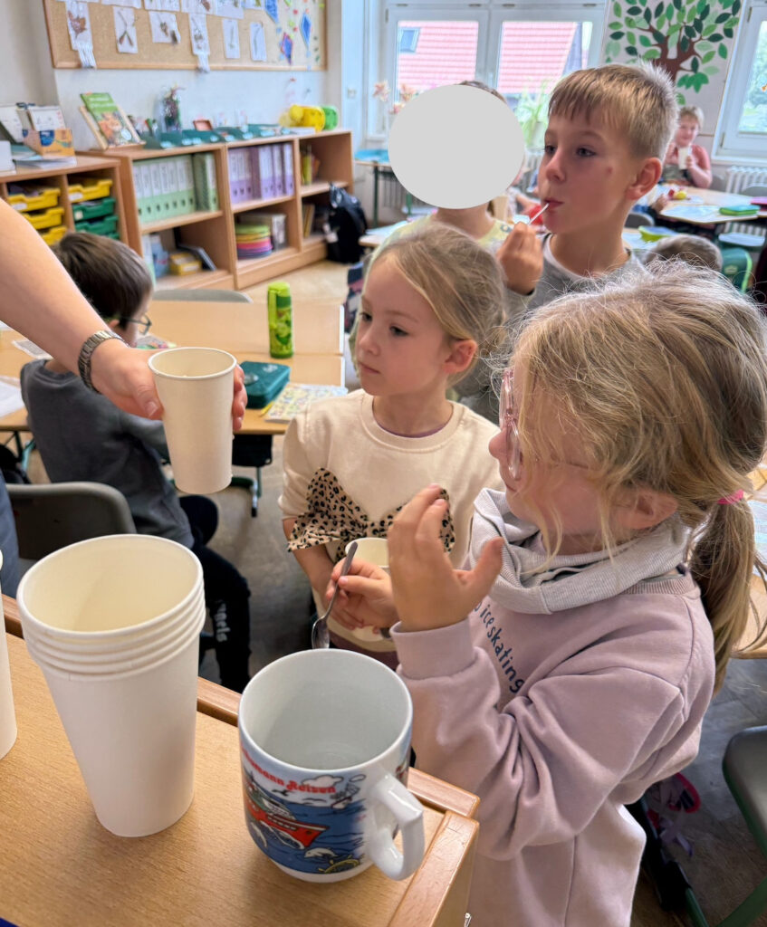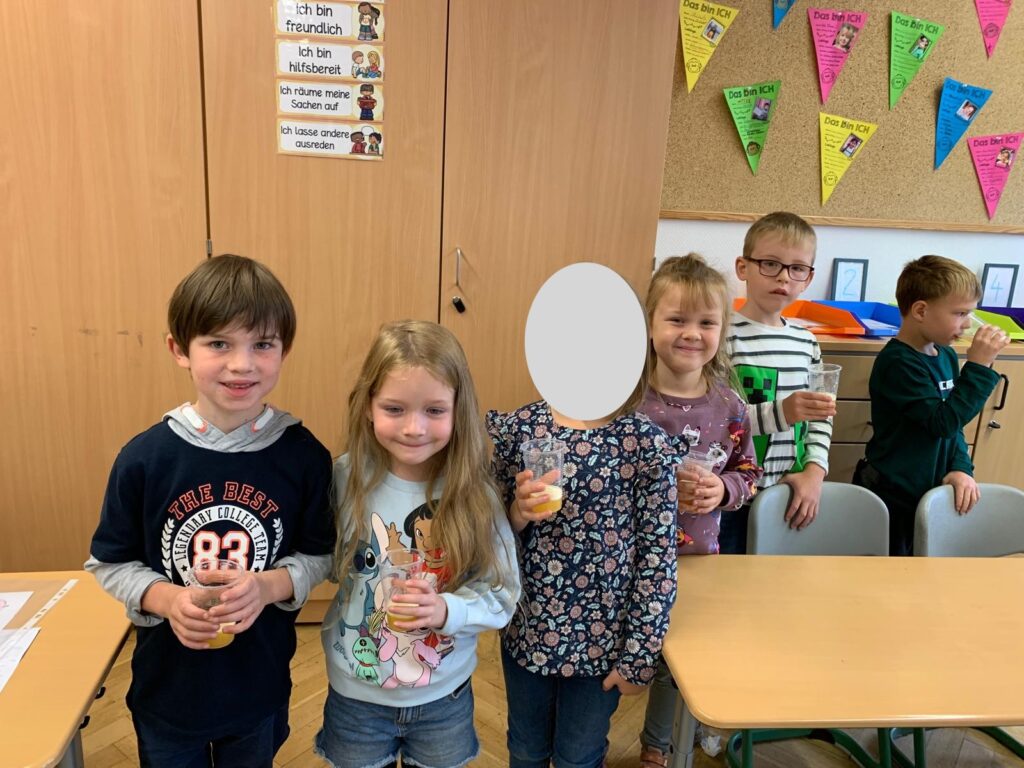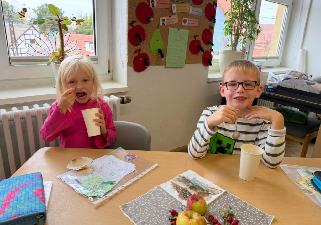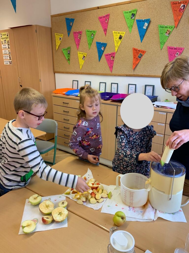 An einer weiteren Station wurde das Innere des Apfels untersucht – sowohl im Quer- als auch im Längsschnitt. Die Kinder erfuhren, dass der Apfel fünf Kammern mit jeweils zwei Kernen besitzt. Diese Beobachtung versuchten sie anschließend selbst zu zeichnen. Zur Belohnung gab es am Ende einen Becher frisch gepressten Apfelsaft – und alle waren sich einig: So ein frischer Saft schmeckt richtig lecker und süß!
