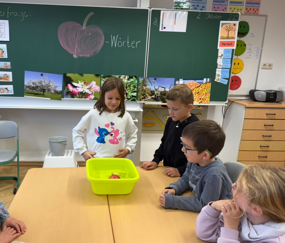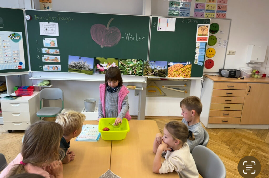 Spannend wurde es bei der Forscherstation mit der Frage: „Schwimmt oder sinkt der Apfel?“ Die Kinder staunten nicht schlecht, als sie herausfanden, dass der Apfel tatsächlich schwimmt, während eine Birne überraschenderweise sinkt! Anschließend sammelten sie passende Apfelwörter, schrieben sie auf und übten das Schwingen der Silben.