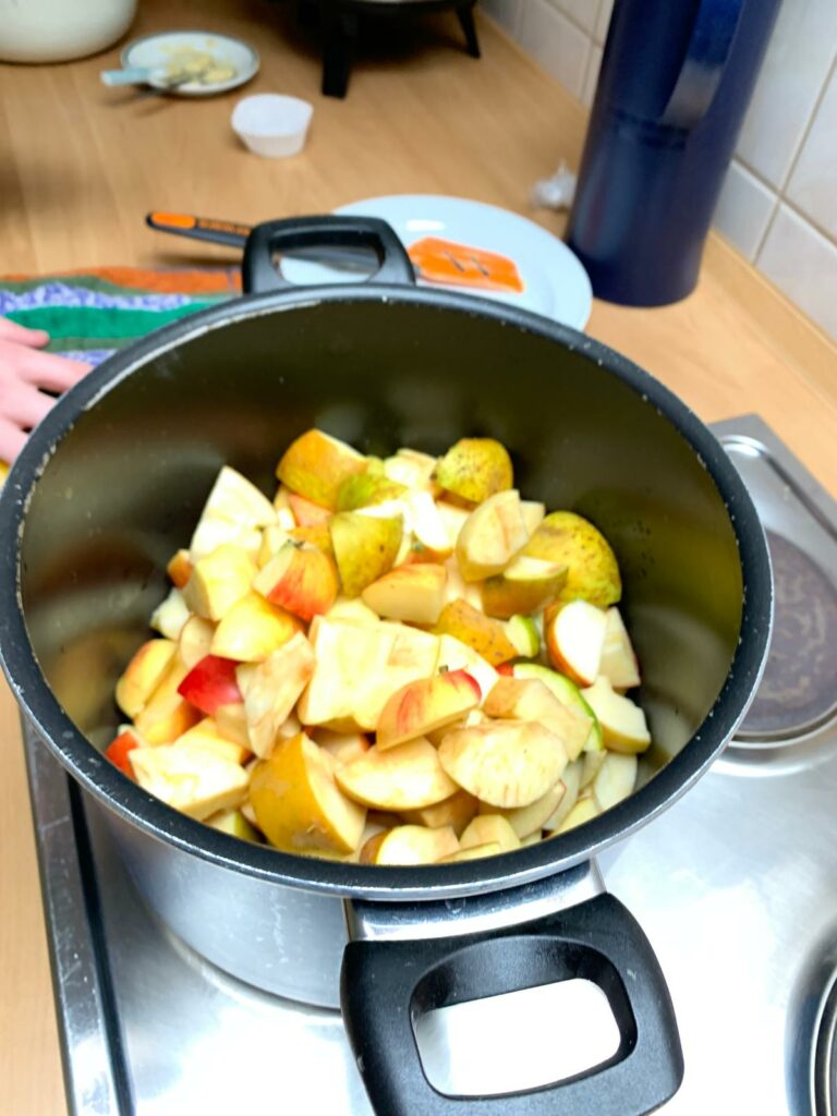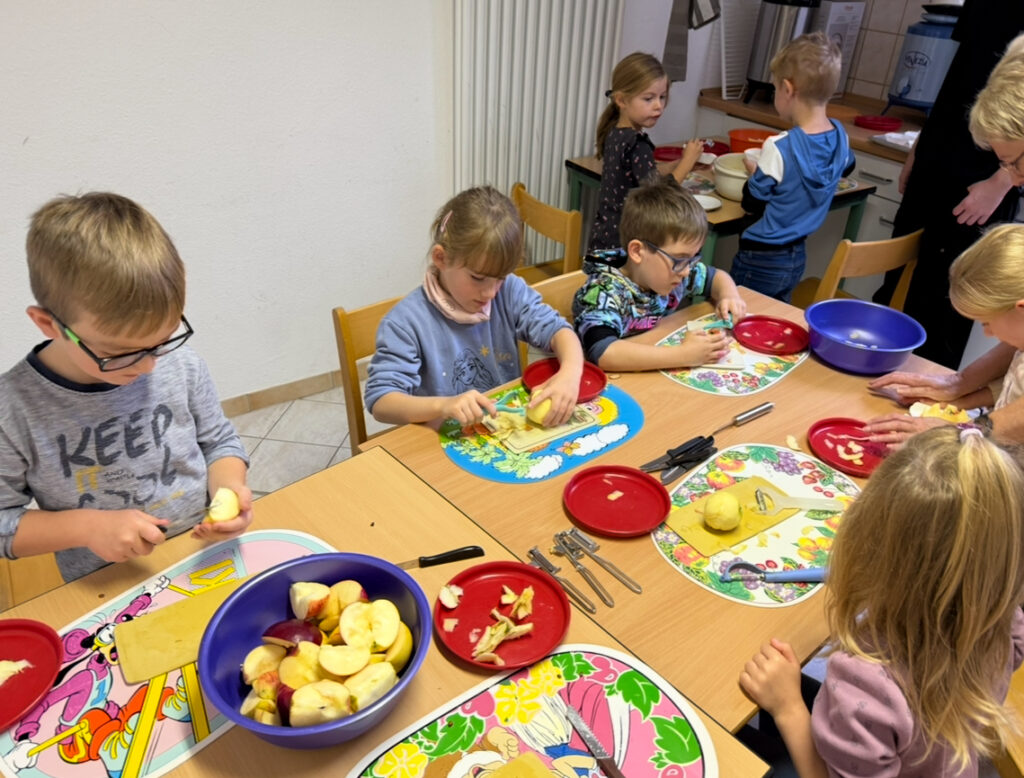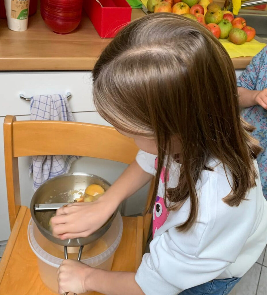 In der Schulküche durften die Kinder selbst Hand anlegen: Äpfel wurden geschält, geschnitten und verarbeitet – gar nicht so einfach! Aus den Apfelstücken entstanden schließlich köstliches Apfelmus und leckere Apfelmuffins.