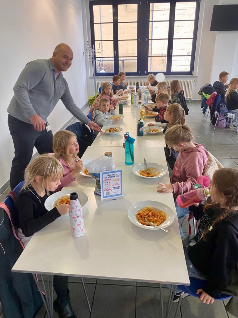 Jetzt freuten wir uns alle auf ein leckeres Mittagessen, welches Herr Mörstedt für uns organisiert hat. Er arbeitet bei Schuler Pressen. In der Werkskantine gab es für uns Nudeln und Tomatensoße. Vielen Dank an die Schuler Pressen GmbH , die uns dieses Essen kostenlos zur Verfügung gestellt haben.