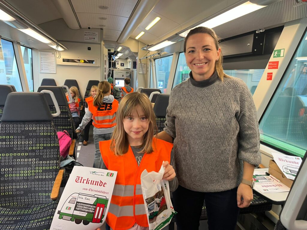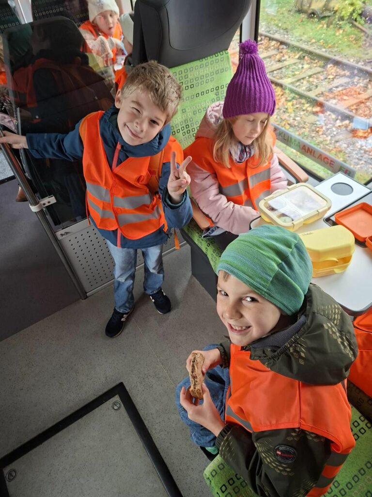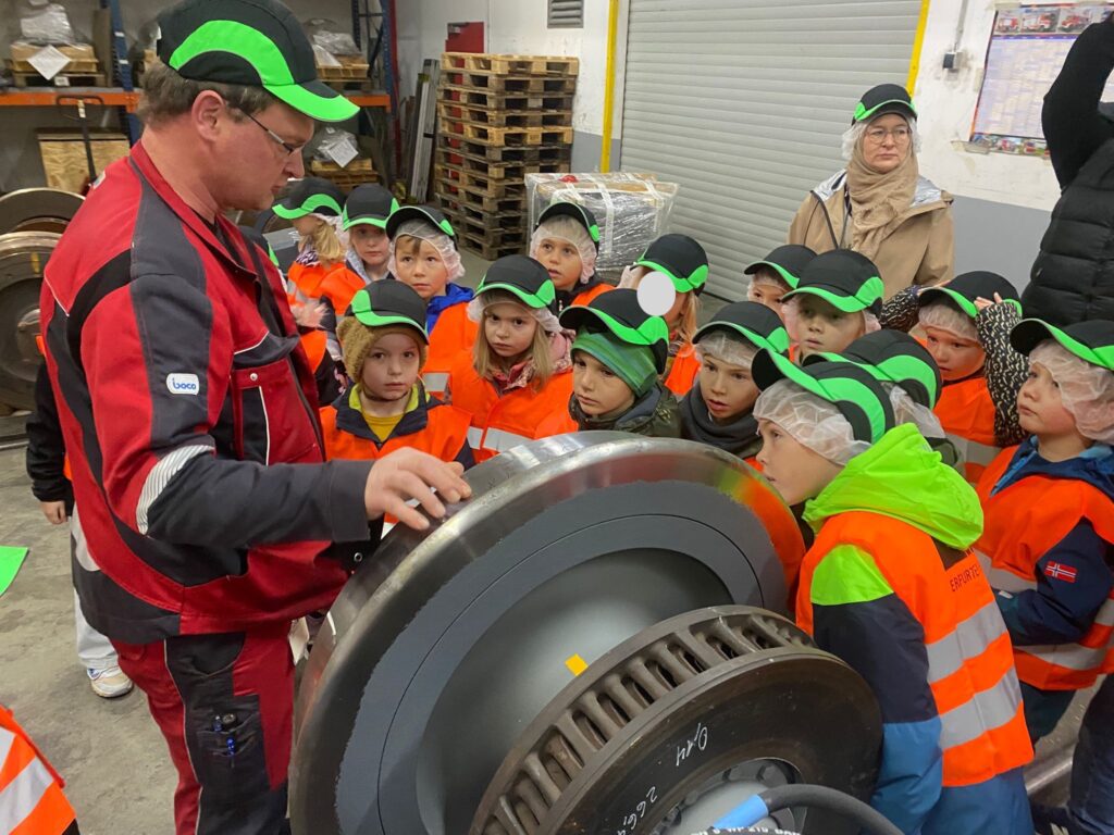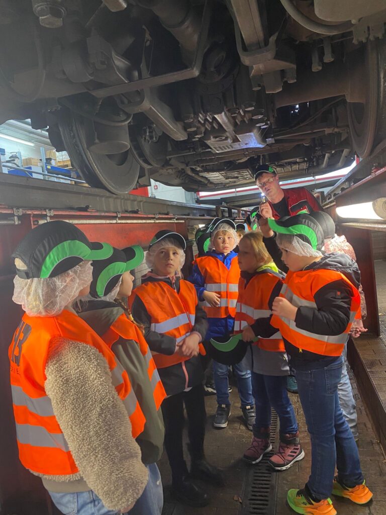 Die Kinder der Klasse 2a waren am Dienstag, 28.10.2025 sehr aufgeregt. Eine Exkursion zur Erfurter Bahn GmbH war geplant. Auf dem Werksgelände angekommen, bekamen wir erst einmal eine Warnweste und eine Schutzkappe. Wir sahen sehr lustig aus. Dann ging es zur Führung in die Werkstatt. Hier hatten wir Einblicke in und unter die Züge, was besonders spannend war. Wir erfuhren, dass alle 8 Jahre die Züge auseinandergenommen, die Teile überprüft und dann wieder zusammengesetzt werden. Besonders beeindruckend fanden wir die schweren Reifen. Da braucht man mehrere Hebebühnen, um einen Reifenwechsel zu machen.